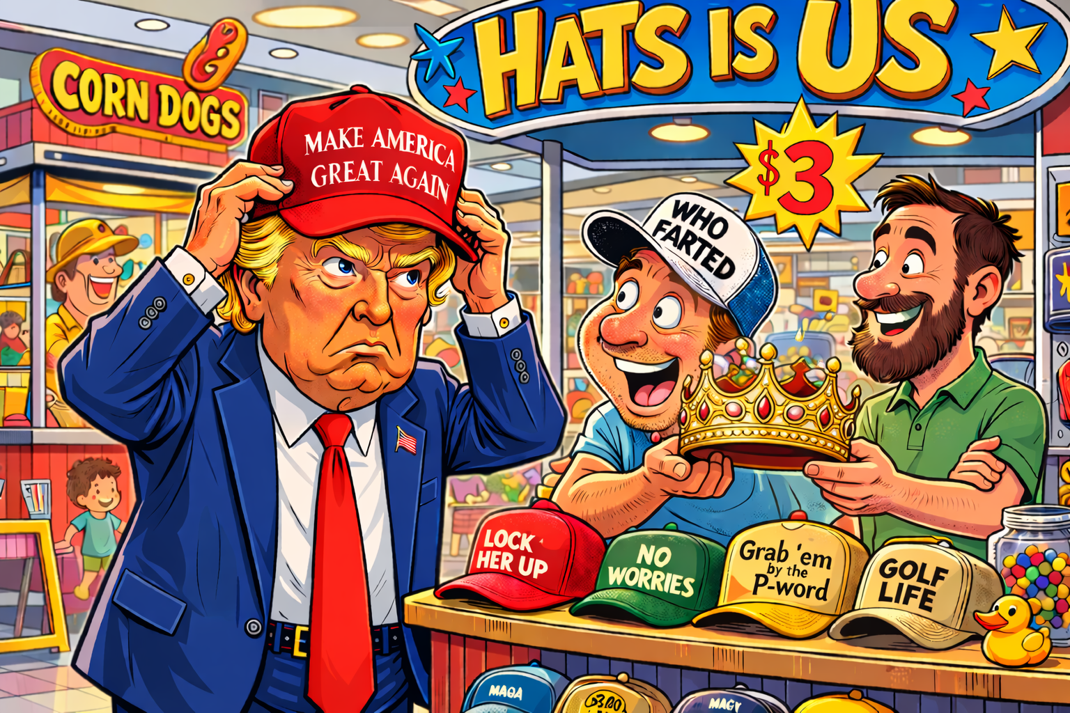 Okay, maybe you got the idea for the first hat when your campaign motorcade stopped at the Sapp Bros. Travel Center to grab snacks and sodas for the next leg of your tour, and you spotted a guy in a golf cap that said, “Who farted?” But come on—it’s been nine years. Surely, by now, you could’ve commissioned Giorgio Armani, Telfar Clemens, Daniel Roseberry, or Tom Ford to design for you a more fitting sky piece, but wait — you'd probably consider all of them too woke.