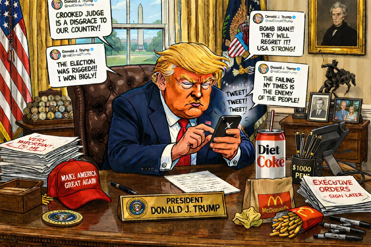 He uses social media to conduct loyalty purges, announce vendettas, trial-balloon abuses of power, and convert personal grievance into public policy. The feed becomes the filter through which state power is announced, tested, and abused.