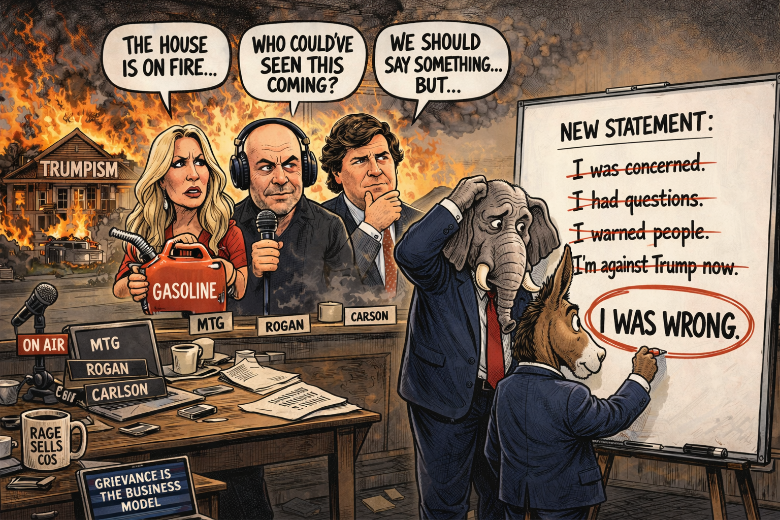 When Marjorie Taylor Greene, Joe Rogan, and Tucker Carlson come out with statements denouncing Trump, the criticism itself is not meaningless. But it still stops short of the one thing that actually matters. Marjorie Taylor Greene does not get to dab at the edges of Trumpism now as though she were some alarmed bystander who had just noticed the house was on fire. She was inside, splashing gasoline on the curtains. She did not merely support Trump. She defended him, echoed him, excused him, and helped make his madness feel familiar to people who should have known better. Joe Rogan does not get to act as though he was just asking questions in some neutral fog. He helped mainstream that perpetually fourteen-year-old, incel-adjacent, “own the libs” attitude that treats politics like a fart joke with a podcast sponsor. He gave dangerous stupidity a casual cultural pass, turning recklessness into entertainment and making contempt for Democrats sound like insight. Tucker Carlson does not get to pose as the belated prophet of truths newly discovered. He was one of the chief architects of the atmosphere that made Trump possible, plausible, and pardonable. He packaged grievance as ideology, cruelty as honesty, and authoritarian rot as common sense delivered in a necktie. None of them were just watching this happen. None of them were innocent consumers of the product. They were promoters, amplifiers, and sanitizers.