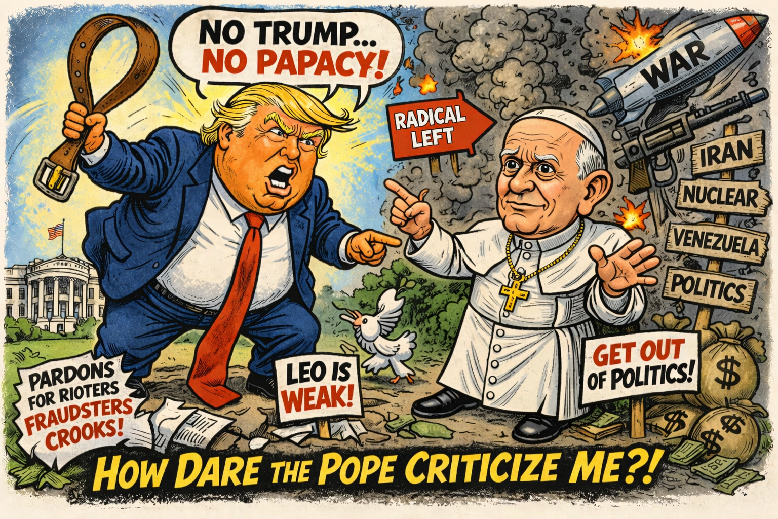 So in summary, Trump attacked the Pontiff for speaking morally about war and peace, then called him soft on crime while personally extending mercy to rioters, fraudsters, bribery defendants, and traffickers, bragged about a “landslide” that was not, and then tried to pass off a Jesus-style vanity image as a medical portrait. Strip away the noise, and what remains is a man who cannot stand criticism from any authority he cannot dominate, not the press, not the courts, not even the head of the Catholic Church.